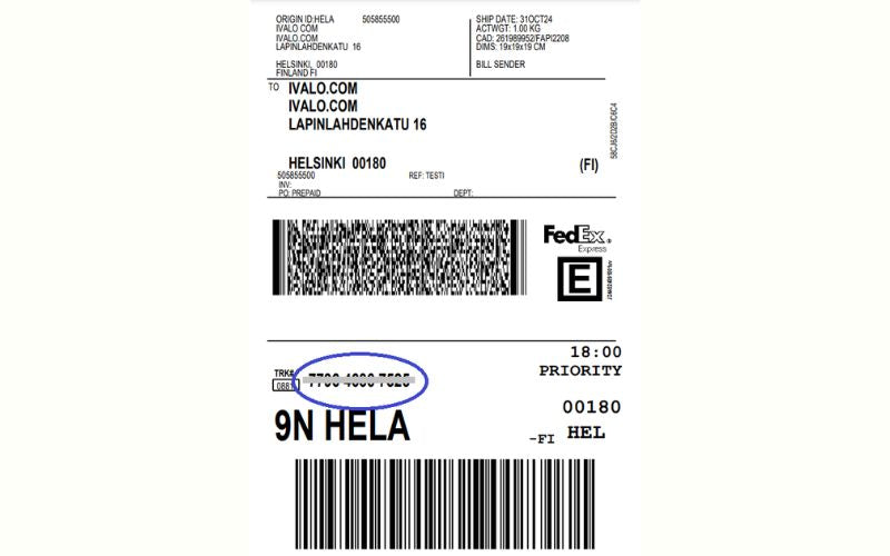 Find the tracking number for your return shipment, which is needed when scheduling a pickup. The 12-digit tracking number is located between the barcodes on the label, as shown in the image below. The tracking number is circled in blue.
