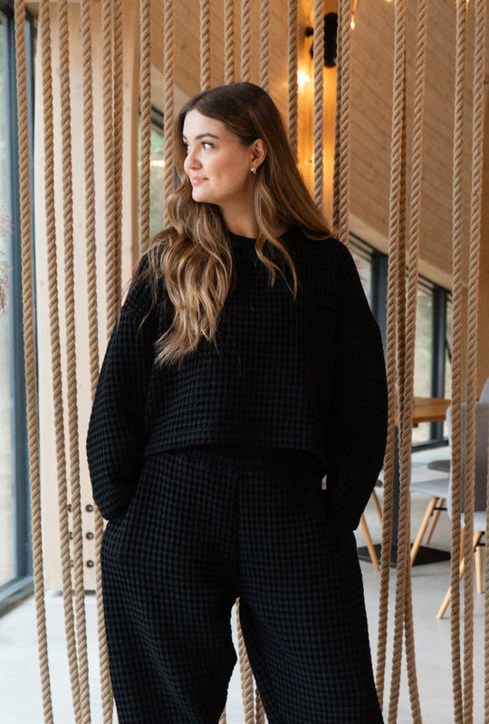 De Aiko-sweatshirt is een aangenaam oversized, wat kortere sweatshirt met gebogen mouwen, gemaakt van gestructureerde honingraatstof. De sweatshirt heeft een uitsnijding aan de achterkant. Samen met de Aiko-broek vormt de sweatshirt de perfecte vrijetijdset.