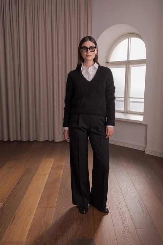 Deze elegante zwarte trui met lange mouwen van een alpacamix heeft een verfijnd V-halsontwerp dat zijn tijdloze aantrekkingskracht versterkt. Gemaakt voor zachtheid, warmte en lichtheid, biedt het de hele dag comfortabel draaggemak. De veelzijdige zwarte tint past moeiteloos bij verschillende outfits, terwijl de luxueuze alpacamix zorgt voor een zachte aanraking tegen de huid. Ideaal voor zowel dagelijks gebruik als speciale gelegenheden, combineert deze trui klassieke stijl met uitzonderlijk comfort.