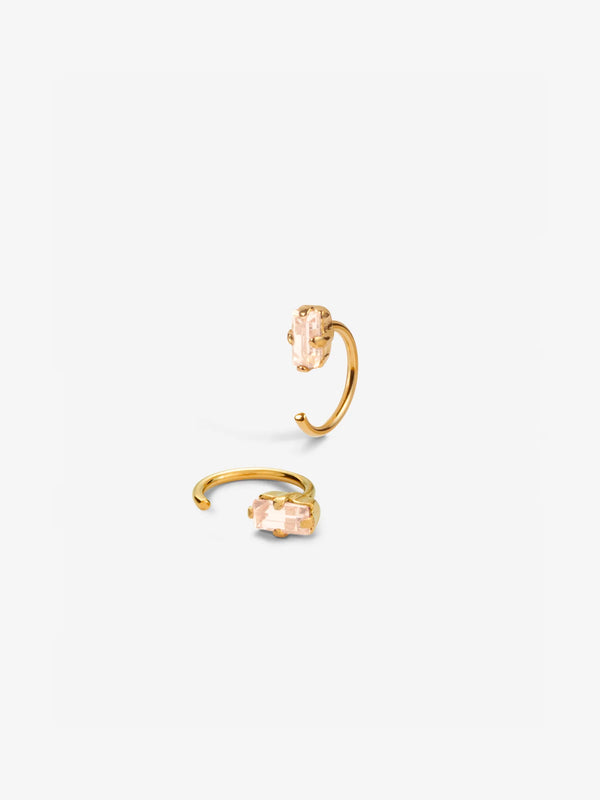 The Marcel mini hoop earrings, with their champagne-colored crystals, rest gracefully on your ears, offering a subtle yet striking style. Their soft color and elegant design make them perfect for any occasion, from everyday wear to special events.