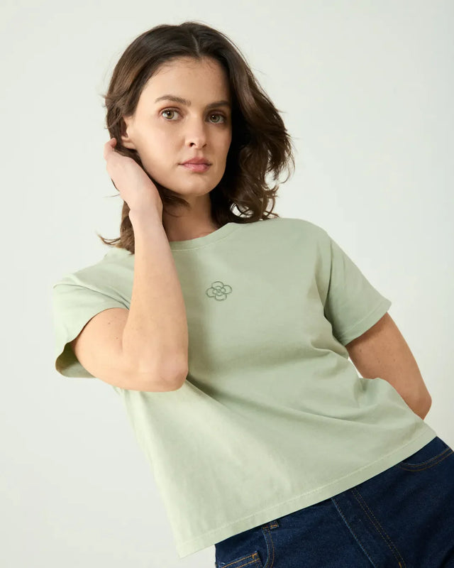Green organic cotton T-shirt with embroidered flower detail. Crafted from 100% certified organic cotton in Portugal, this short-sleeved essential features a distinctive apple green hue achieved through Nano Earth dyeing technology—a sustainable process that reduces water consumption, dye waste, and energy use while ensuring superior color fastness and even penetration. The subtle stonewashed finish adds depth and character. Exceptionally soft and breathable for everyday wear. Style solo with denim or layer with the coordinating shorts and sweatshirt for a cohesive collection.
