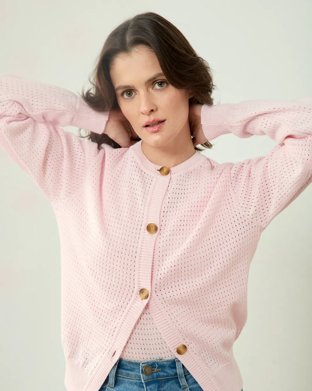 Crafted from certified organic cotton in a family-run Ecuadorian workshop, this pale pink cardigan delivers understated elegance through its delicate openwork knit. The breathable, soft fabric works seamlessly layered over basics or paired with complementary pieces for a refined, cohesive aesthetic. A versatile wardrobe essential that balances minimalist design with thoughtful construction.