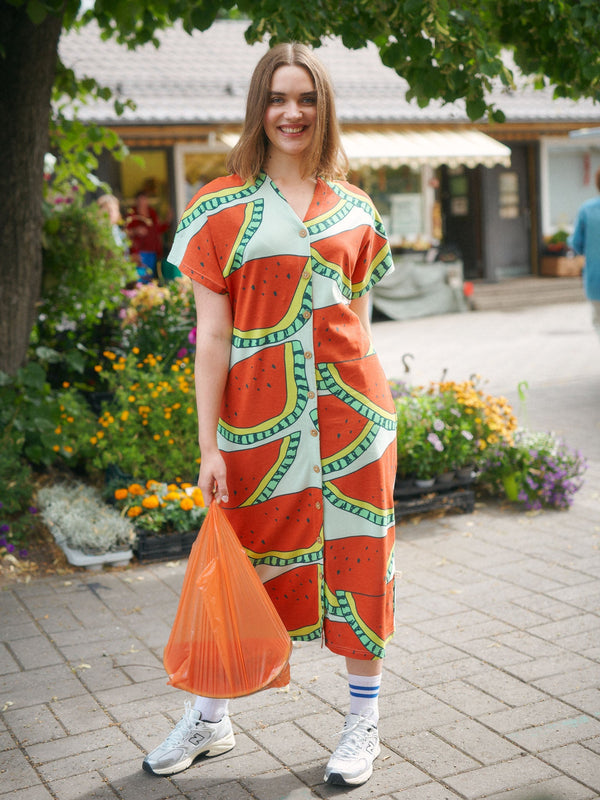 Casual rechtlijnige jersey jurk met een knoopsluiting en een afneembare riem. Het heerlijke rode en groene watermeloenpatroon is perfect voor zomerdagen.