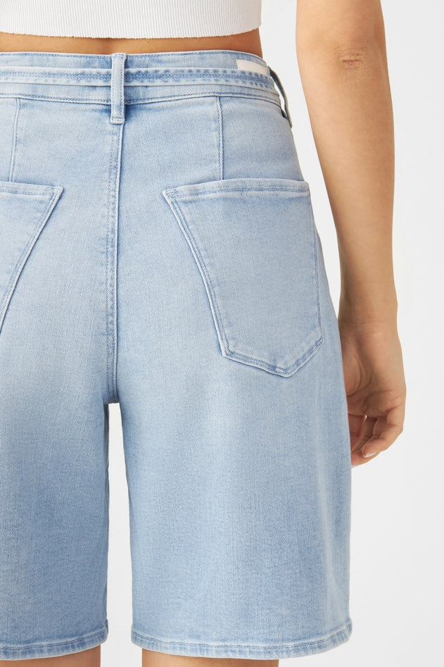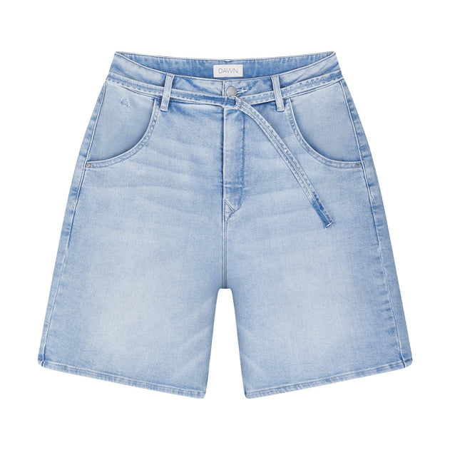 Hoog getailleerde lichtblauwe denim shorts met een wijde snit. Unieke afgeronde voorzakken en opgestikte achterzakken. Coupenaden aan de achterkant voor een meer op maat gemaakte pasvorm. Een afneembare dunne bijpassende riem wordt meegeleverd met de shorts.