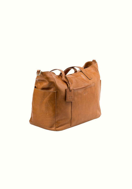 Gebouwd met 100% plantaardig gelooid leer. De tas heeft twee zijvakken, één voorvak en één intern vak