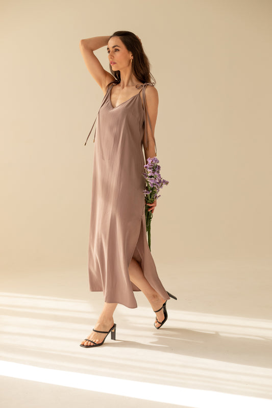 De jurk heeft een maxi lengte en zijsplitten die tot aan de dij komen, dunne geknoopte bandjes afgewerkt met een decoratieve gouden punt. Het is gemaakt van zachte en vloeiende cupro viscose met een zogenaamde koele aanraking.