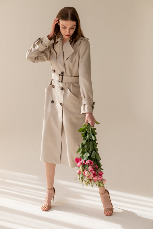 Licht beige zijden trenchcoat is een klassieke elegante lange jas gemaakt van zijden keperstof. De jas heeft een iets lossere snit, een strak getrokken kraag en schouderstukken. De jas heeft een dubbele rij knopen. Daarnaast heeft het een lange gesp riem in de taille en gespbanden op de mouwen, die kunnen worden aangepast.
