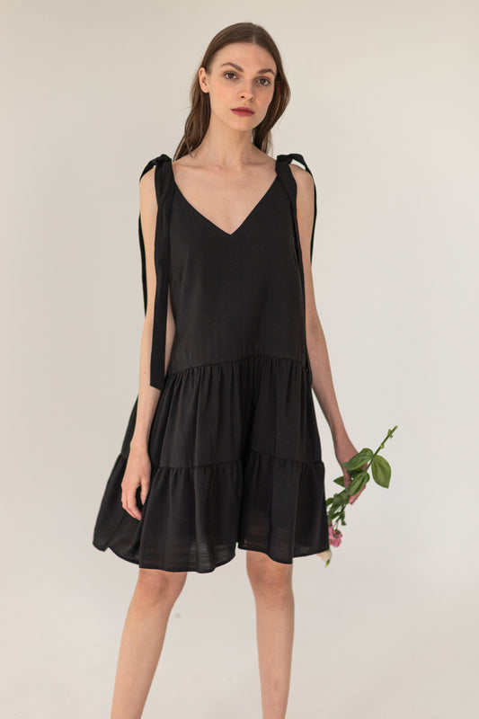 Zomer zwarte jurk geknoopt bij de schouders is een ideale keuze voor de zomer. De jurk heeft een losse oversized snit, zakken in de naden. V-vormige halslijn. De jurk is afgewerkt aan de onderkant met een dubbele ruche, zeer licht gekreukt. De bandjes zijn lang verstelbaar, ze kunnen op verschillende manieren worden vastgebonden, strikken of losgelaten. De jurk is uiterst comfortabel en luchtig, gemaakt van viscose en viscose voering. De jurk is ook verkrijgbaar in rood, zwart en beige.