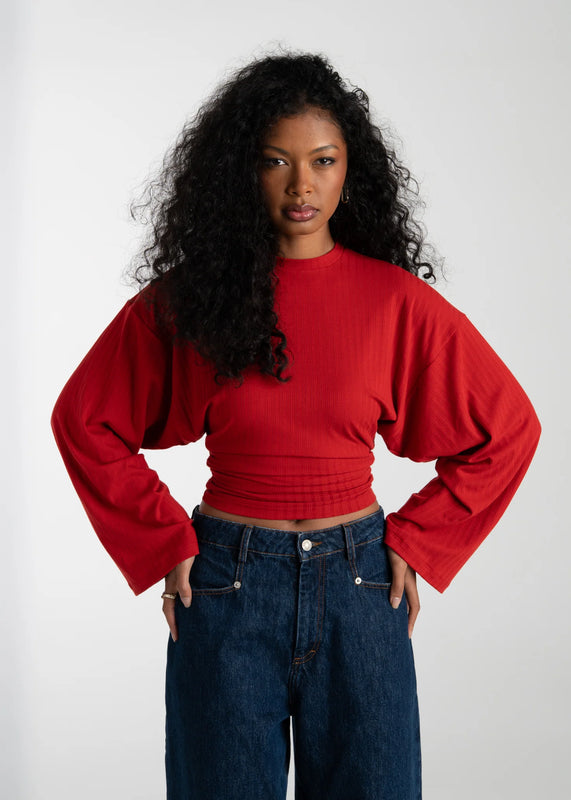 Espresso Fitted Long Sleeve Blouse in Red Crafted from 95% cotton and 5% elastane deadstock fabric, this versatile blouse combines comfort with refined style. The fitted silhouette features a subtle ruched detail at the waist and soft stretch for ease of movement throughout your day. Designed with an oversized fit that balances structure and comfort, the defined waist and gentle shaping create a flattering, modern look. The ribbed texture adds visual interest, making it perfect for layering or wearing as a standalone piece.