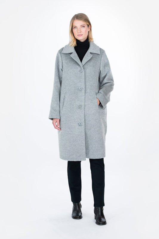 Omena wool coat is classically timeless. The straight-lined coat has curved vertical cuts on the front and back, giving it a slim look. The pockets are embedded in the cuts of the front piece. The coat has a button fastening and a lapel collar, which you can button all the way up. The coat is made of high-quality olive green Italian wool-blend fabric. The lining fabric is acetate viscose.