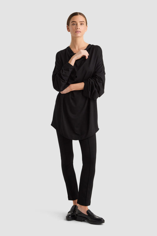 De Gennova Top Zwart toont een elegante verlengde silhouet met een zacht vloeiende watervalhalslijn die een vleugje verfijnde elegantie toevoegt aan de garderobe van jouw. De lange, losse mouwen bieden gemak en comfort, terwijl de afgeronde zoom een moderne, flatterende afwerking introduceert. Ontworpen om gepolijste, moeiteloze mode te weerspiegelen, balanceert deze top naadloos stijl en comfort.