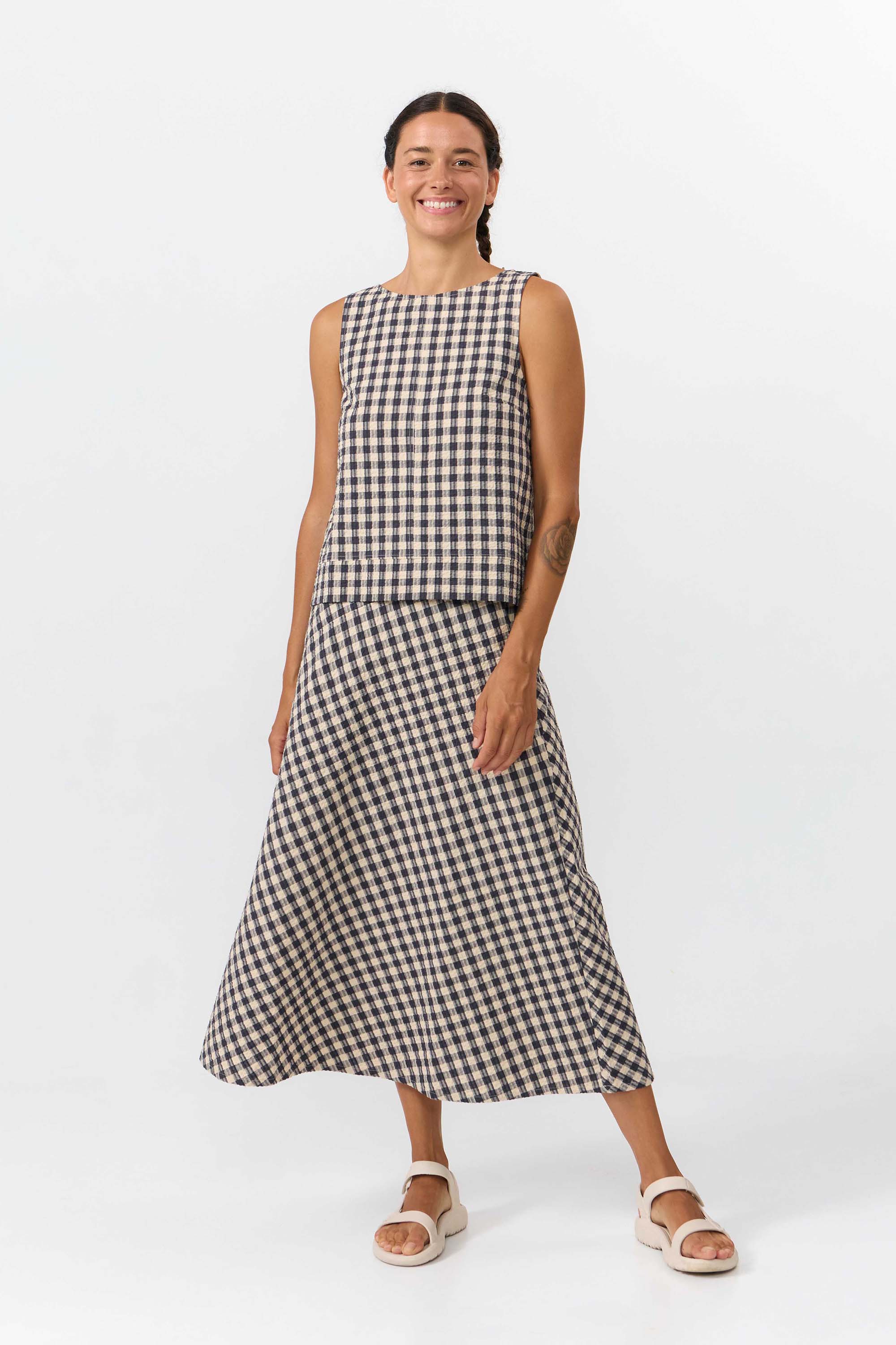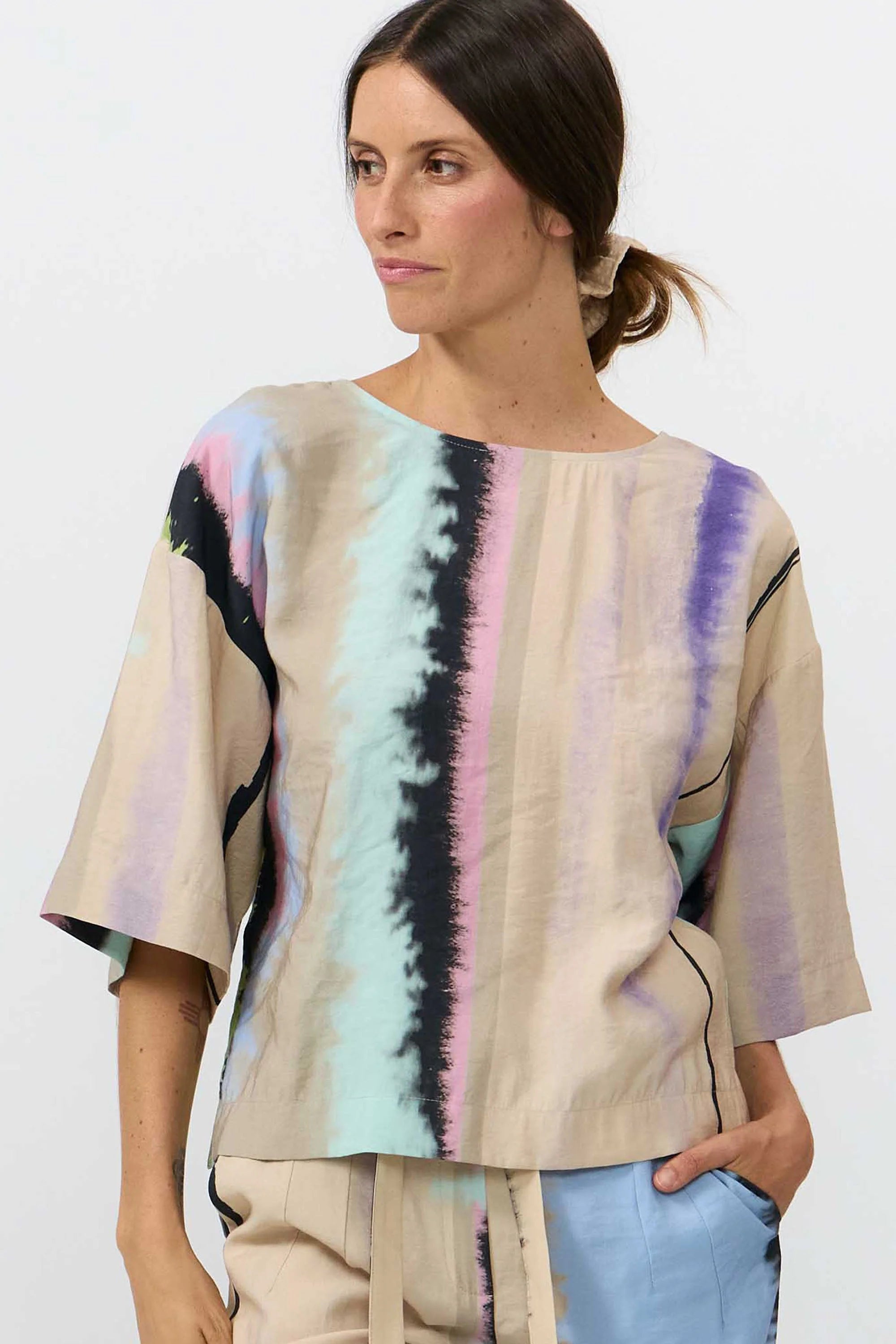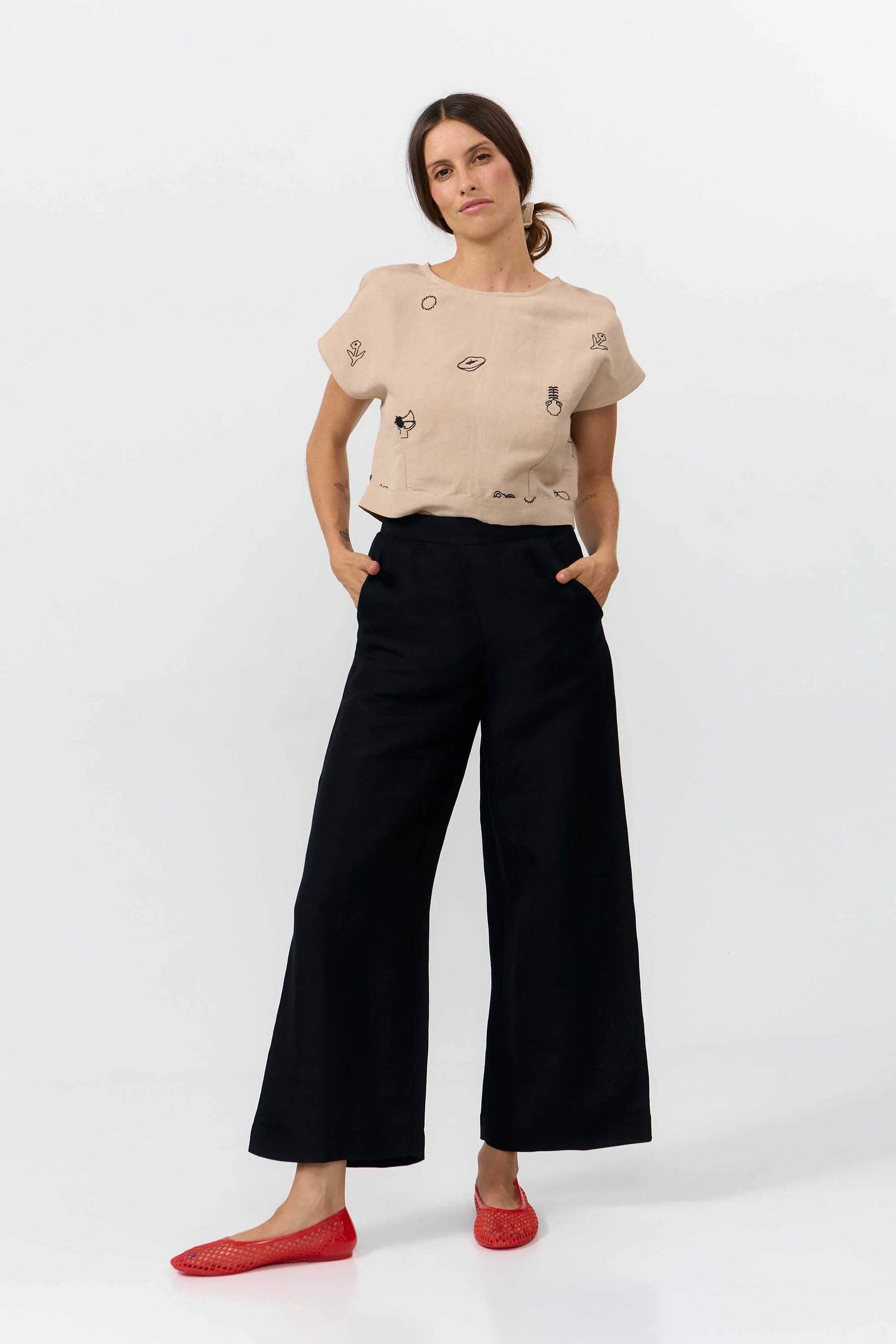 Geborduurde cropped top met verlaagde schoudermouwen en ronde halslijn. Met een sluiting aan de achterkant met een veganistische corozo-nootknop. Het is comfortabel, ademend en gemakkelijk te stylen. Een betrouwbaar stuk dat precies in de dagelijkse routine past.