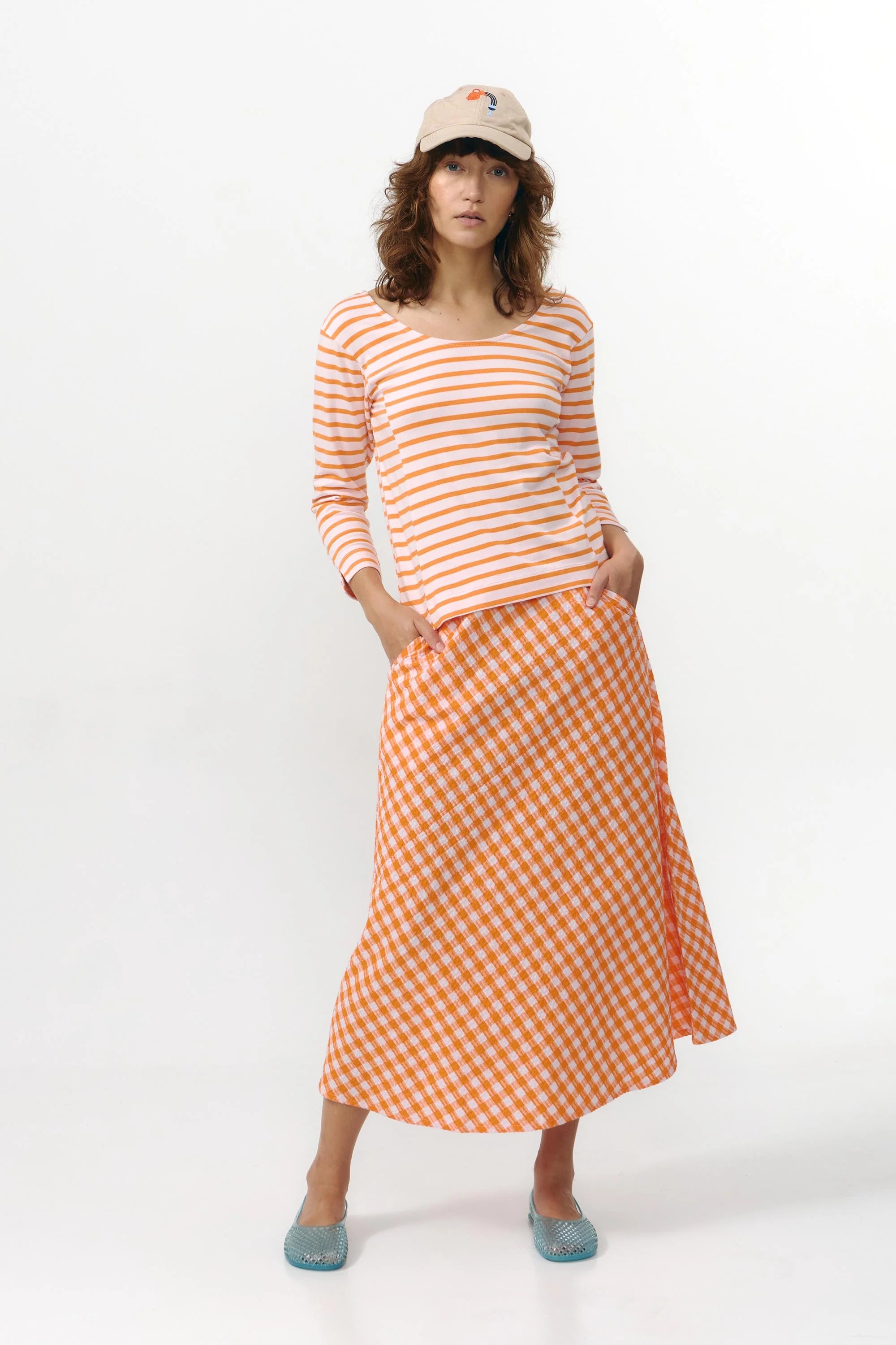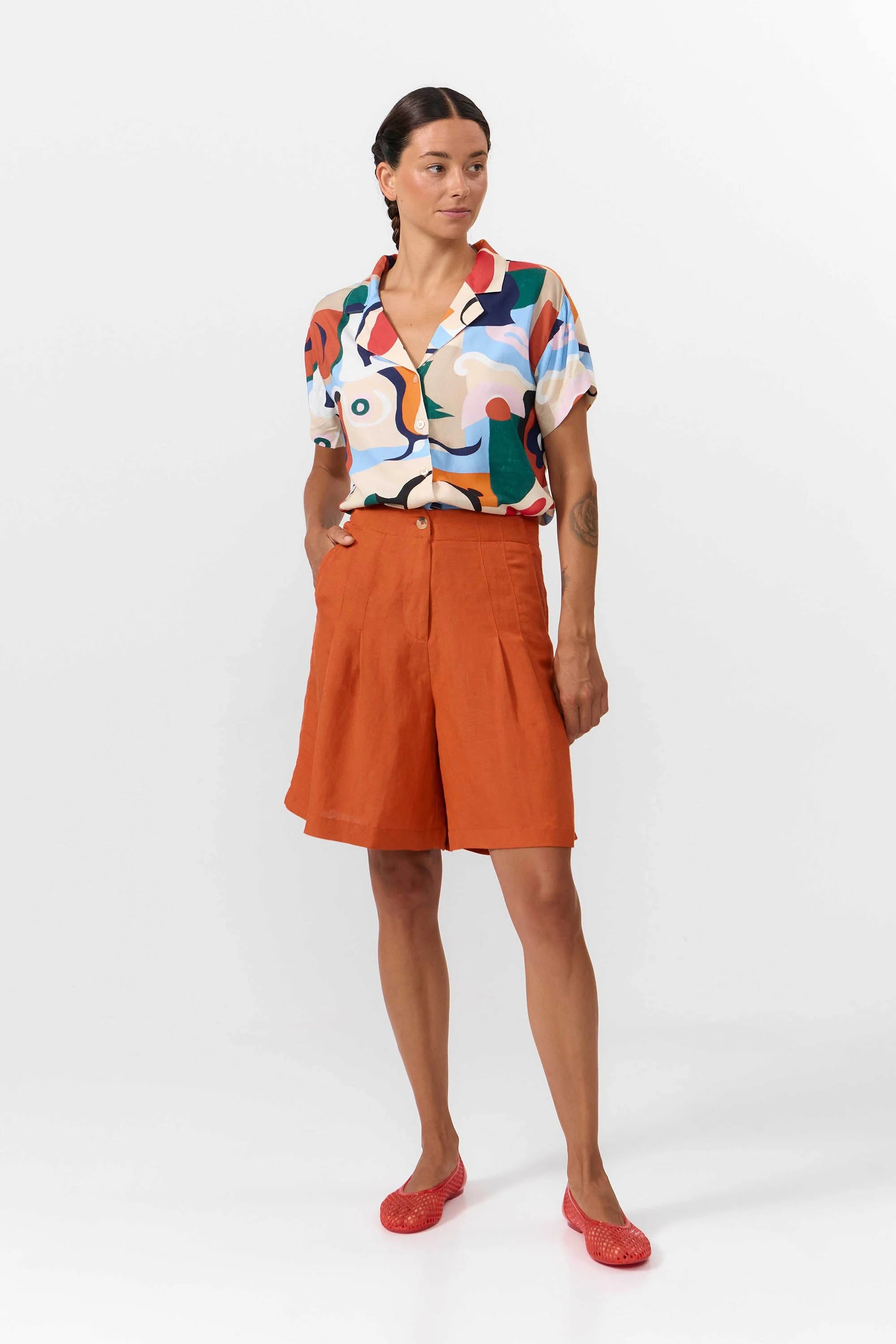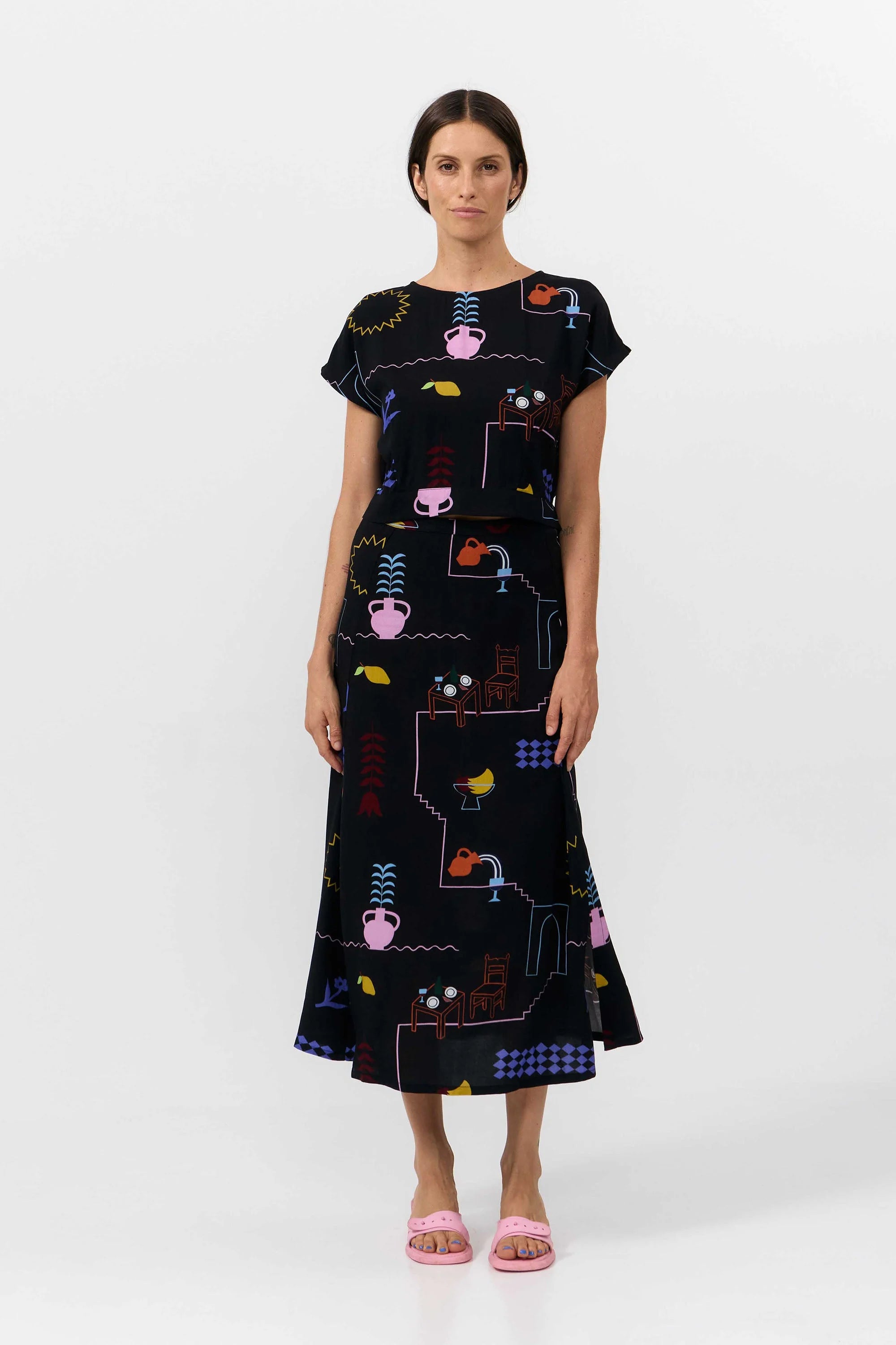 Geborduurde cropped top met verlaagde schoudermouwen en ronde halslijn. Met een sluiting aan de achterkant met een veganistische corozo-nootknop. Het is comfortabel, ademend en gemakkelijk te stylen. Een betrouwbaar stuk dat precies in de dagelijkse routine past.