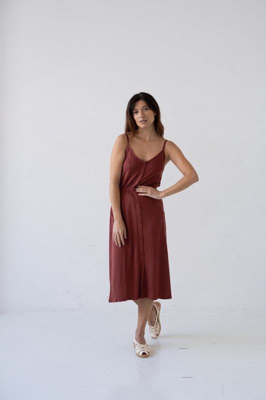 Ontdek de Hiara-jurk, vervaardigd in een flatterende midi-lengte met een knoopsluiting aan de voorkant met praktische knopen gemaakt van natuurlijk geverfde corozo-noten. De taille is op maat gemaakt om jouw vorm te accentueren, aangevuld met elastiek voor comfort de hele dag door. Gemaakt van premium TENCEL™ Lenzing-stof geverfd met milieuvriendelijke kleuren, biedt deze jurk uitzonderlijke zachtheid en huidvriendelijk draagcomfort. Ideaal voor de zomer, het combineert elegant met het zwarte Giola-jasje voor koelere avonden. Gepresenteerd in een levendig robijnrood uit de Origin Basics-collectie, belichaamt het energie, passie en zelfvertrouwen. Jersey 100% Lenzing TENCEL™ - 200 g/sqm. Ontworpen in Barcelona en verantwoord geproduceerd in India. Regular fit.