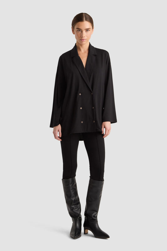 De Huberta Blouse Zwart heeft een tijdloos double-breasted ontwerp met milieuvriendelijke kokosnootknopen, gemaakt van bijproducten uit de voedingsindustrie. Deze blouse biedt een ontspannen, rechte lange pasvorm, aangevuld met een ronde zoom, lange mouwen en een klassieke kraag, wat zorgt voor een verfijnd maar comfortabel silhouet, ideaal voor zowel professionele als casual omgevingen.