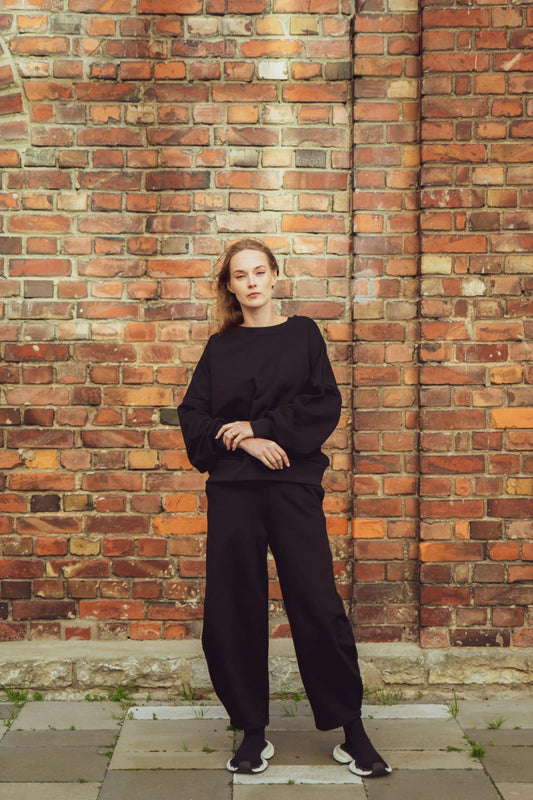 Jone broeken zijn wortelgesneden, comfortabele oversized broeken met een licht gebogen pijp. Jone broeken hebben een brede en zachte elastische tailleband, en de broeken hebben ook zakken. De stof van Jone broeken is niet een zogenaamde gewone, klassieke sweatshirtstof, we hebben meer dan een jaar naar deze stof gezocht en tientallen verschillende tests gedaan, maar pas nu kunnen we zeggen dat we de juiste (weliswaar aanzienlijk duurder dan gepland) stof hebben gevonden en we zijn 100% tevreden met het resultaat. De broeken vormen samen met de Jone sweatshirt een ideaal vrijetijdsset.