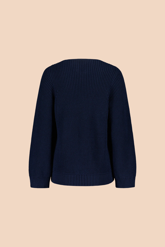 Deze V-hals trui in marineblauw is gemaakt van 100% organisch katoen, wat zachtheid en ademend vermogen garandeert. Met een aangesloten schouderontwerp, brede mouwen over de volledige lengte en geribde zomen en manchetten, combineert het structuur met comfort. De ontspannen, losse pasvorm maakt het een ideaal laagjesstuk voor zowel casual als verfijnde stijlen.