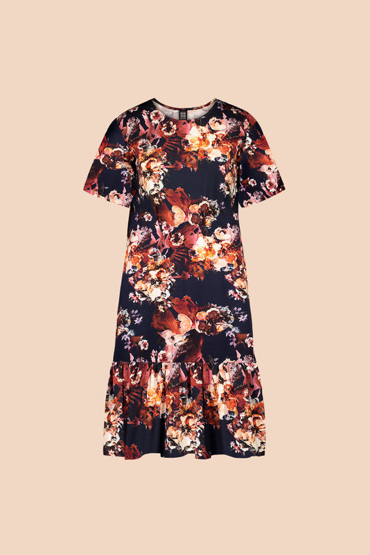 Met zijn ontspannen pasvorm en speelse details, waaronder iets verlengde t-shirtmouwen en een gerimpelde zoom, biedt deze jurk een nonchalante silhouet. Het Cobalt Rose patroon is een studie van een tuin geschilderd door maanlicht, en heeft aquarel bloemen die zich uitstrekken op een donkerblauwe achtergrond.