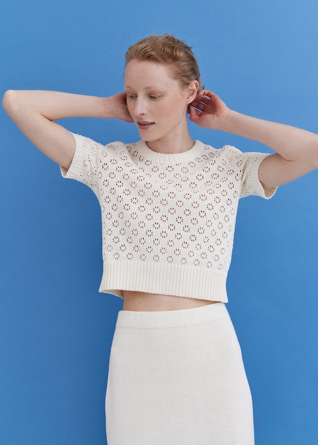 Gebreide set inclusief een wit kanten top met korte mouwen en een maxi rok. Gemaakt van laag-impact ZERO® katoen - het is zacht, natuurlijk, en voelt licht aan op het lichaam en zacht op de huid.