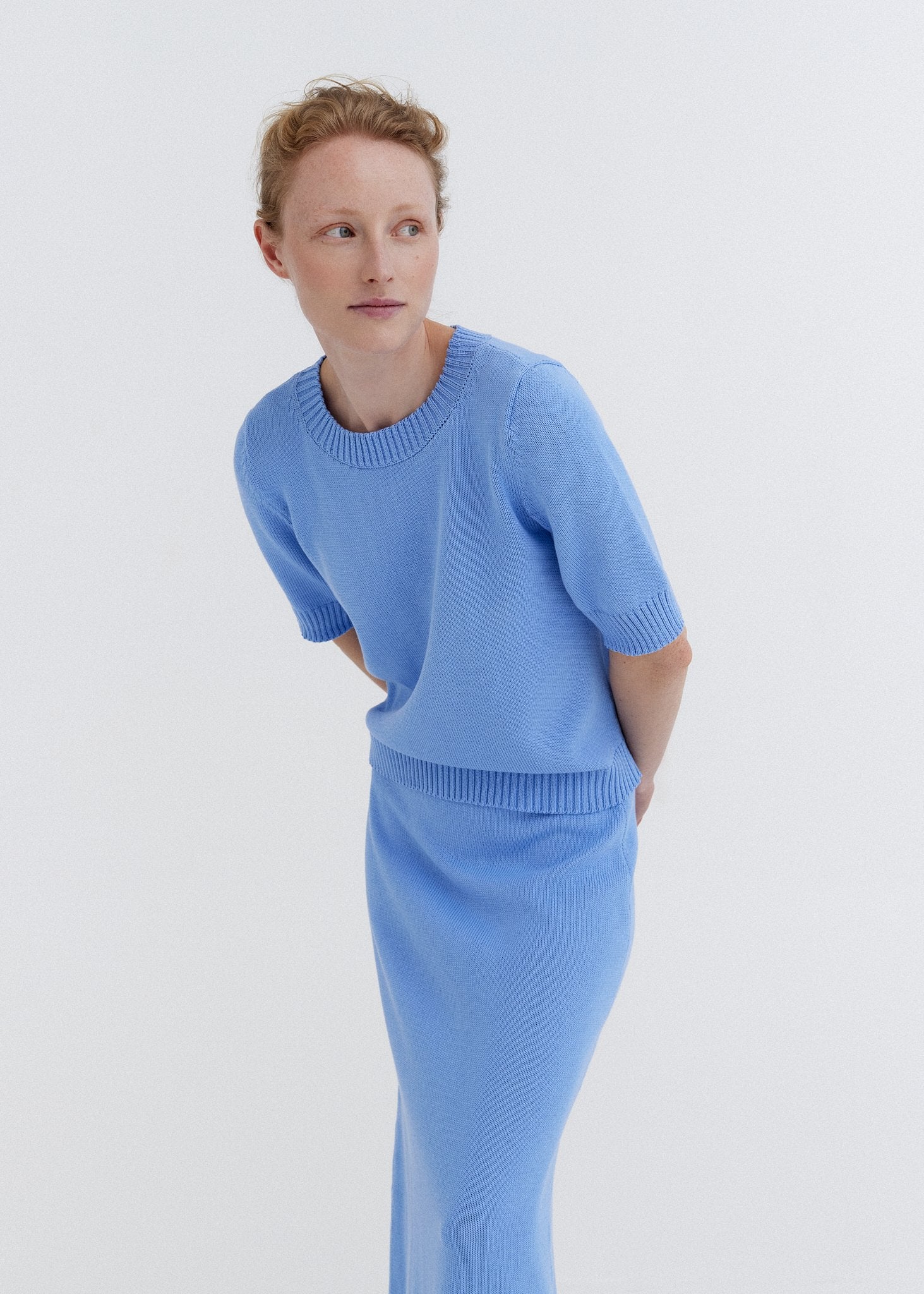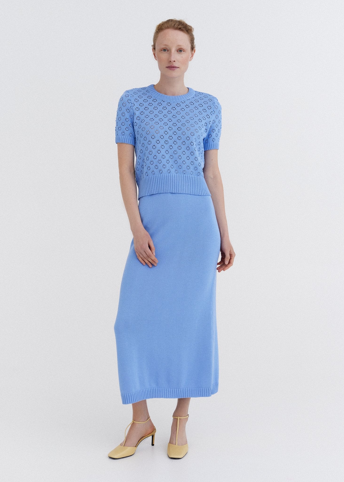 Knitted set including a white sleeved lace top and a maxi skirt. Crafted from low-impact ZERO® cotton – it’s soft, natural, and feels light on the body and gentle on the skin.