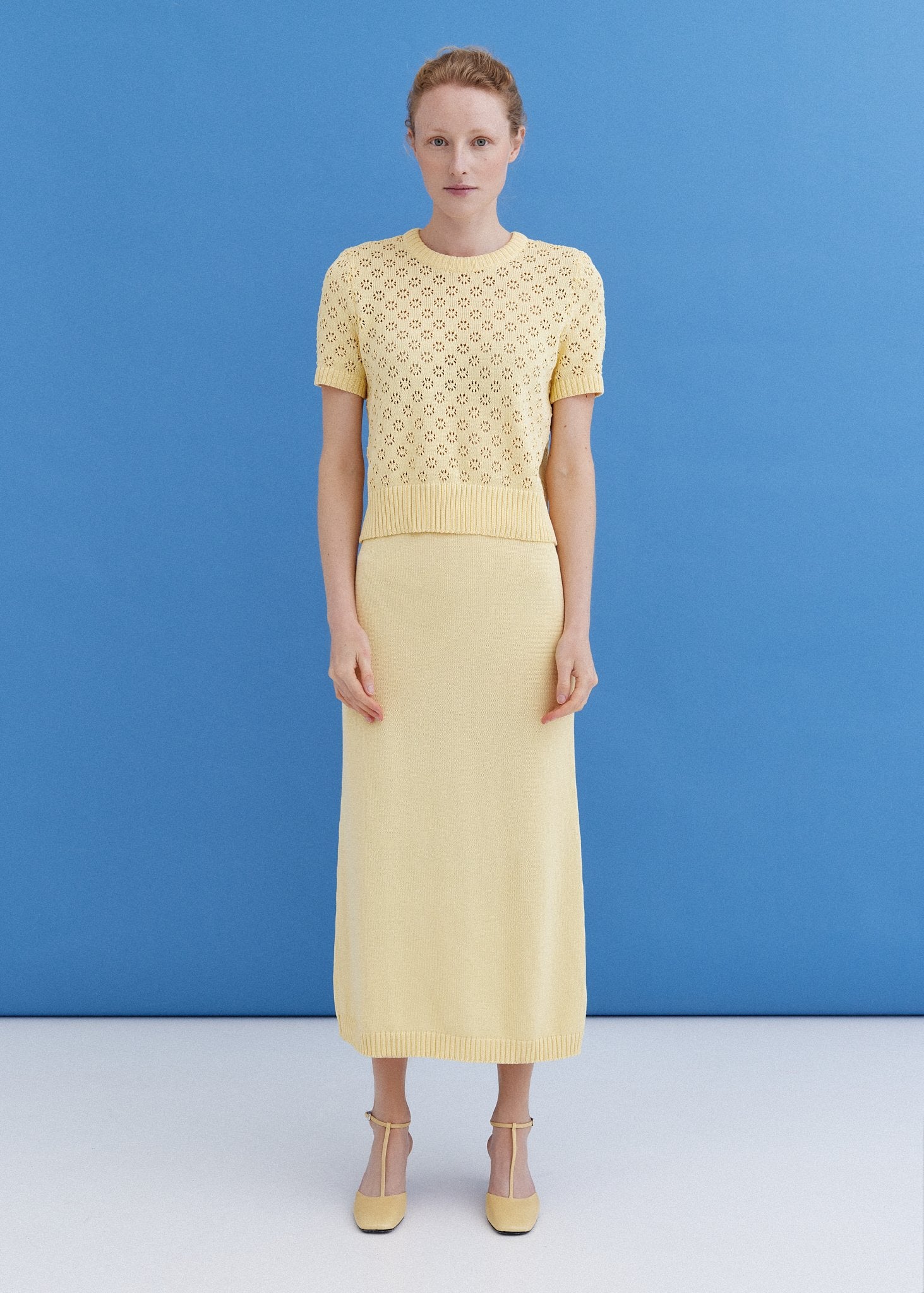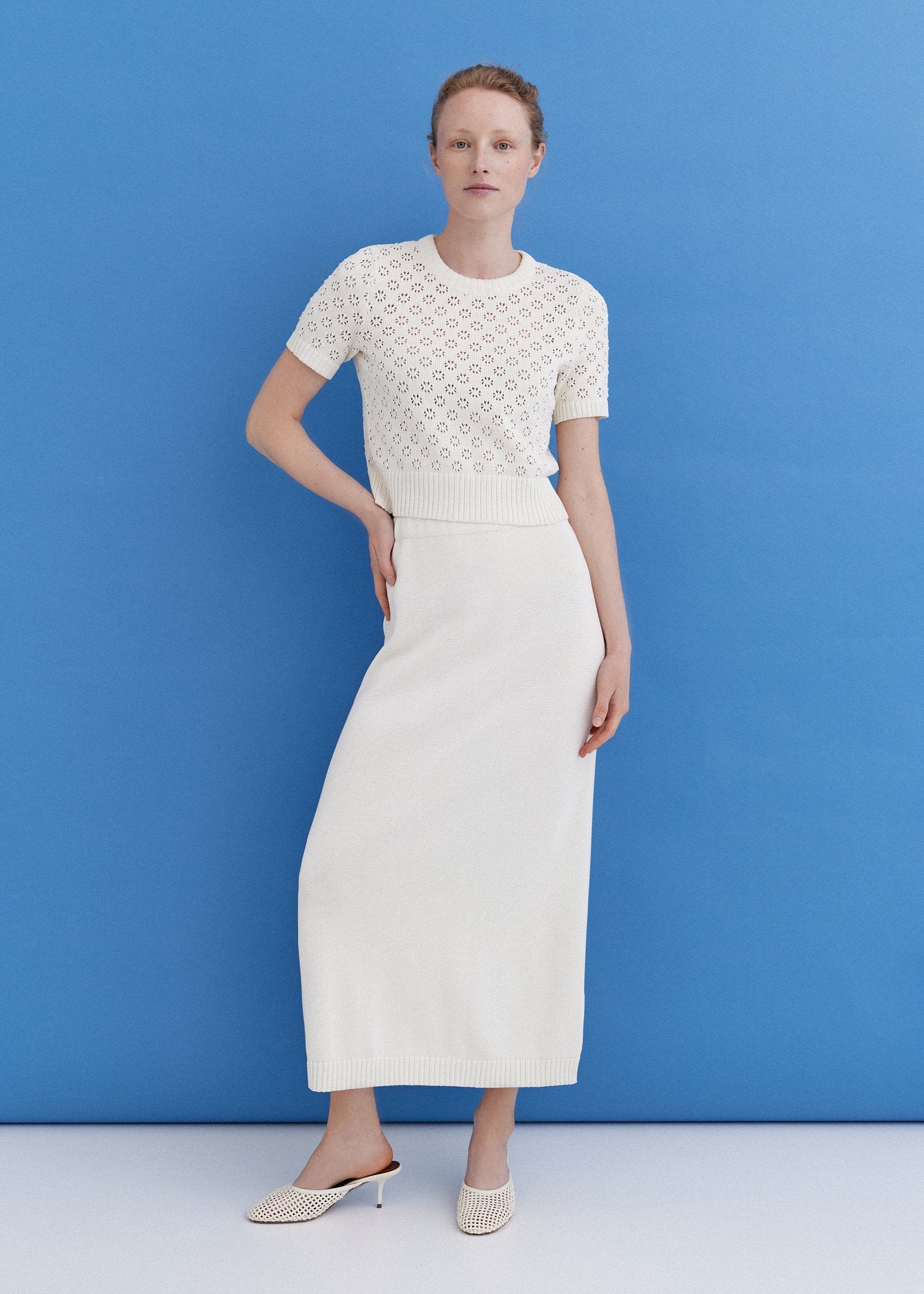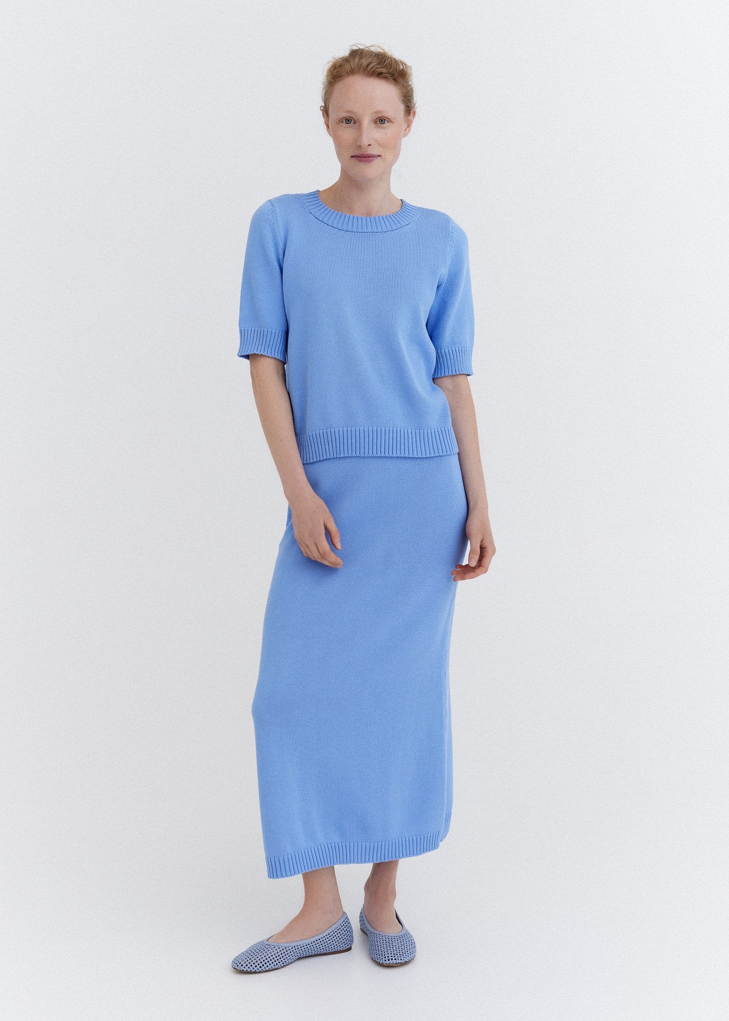 This long knitted skirt is designed to go with everything and last through everything. It offers a clean silhouette with a natural drape and effortless comfort. The elasticated waist gives flexibility without compromising elegance – wear it high or low, how you like.