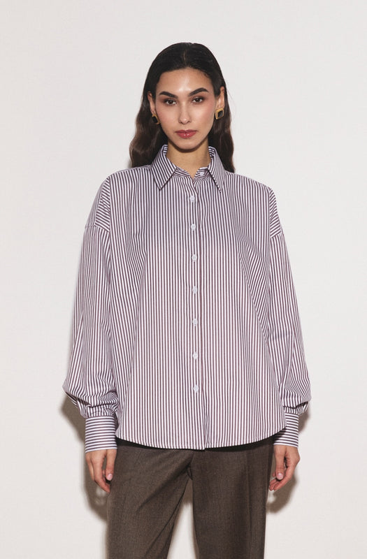 Het Classic oversized overhemd met blauwe strepen combineert Parijse elegantie met ontspannen tailoring. Het is gemaakt van eersteklas katoenen popeline en heeft een verstevigde kraag, decoratieve parelknopen, verlaagde schouders en een verlengde achterkant voor een moeiteloze stijl. De lange mouwen vallen zachtjes samen bij de manchetten.