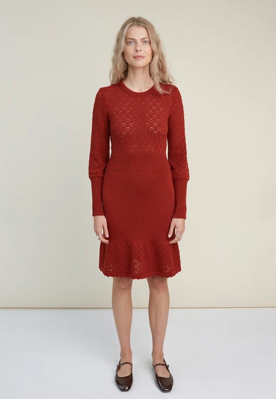 Deze elegante gebreide jurk van kant is gemaakt van ultrazachte merinoswol en zal je hart veroveren. De jurk heeft een vloeiende A-lijn knielange rok en een subtiel kantpatroon in het bovenste gedeelte en aan de zoom, wat een vleugje elegantie toevoegt aan de hele look. De golvende zoom en manchetten maken deze jurk nog meisjesachtiger, maar dat betekent niet dat deze jurk er alleen maar om draait. Combineer deze gebreide kanten jurk met stoere laarzen en andere funky stukken om {{196017} persoonlijkheid en stijl te onthullen. De jurk is gemakkelijk te stylen, ongeacht de gelegenheid.