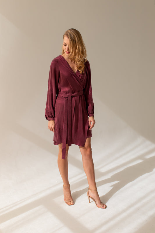 Laurel rode wijndress is een elegante cocktailjurk. De jurk heeft een gesloten envelopsnit en een ritssluiting aan de zijkant. De jurk is iets losjes in de taille en heeft een aparte riem waarmee je de taille kan aanpassen, in een strik kan binden of los kan laten. De mouwen van de jurk zijn iets gebufferd bij de manchet, vastgemaakt met een met stof beklede knoop. De jurk is gemaakt van cupro vloeiende stof, met een viscose voering.