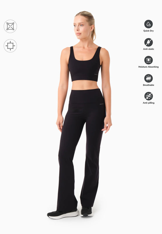 LAVINN Sport Pants in Black deliver performance and refinement for active pursuits. The high-waisted, slim-fit silhouette with subtle flare creates an elegant line while the elastane interlock fabric—56% recycled polyamide and 44% elastane—provides exceptional stretch and breathability. Quick-drying and anti-static properties support dynamic movement through yoga, Pilates, and moderate-intensity training. Signature 3D logo detailing at the back waistband and front left adds contemporary sophistication. Ankle length, designed for a 1.76 m model wearing size S.