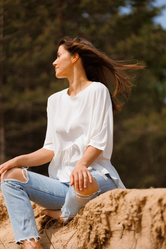 Liisa is een losse T-shirt met ruches, gemaakt van katoensatijn met een subtiele glans.