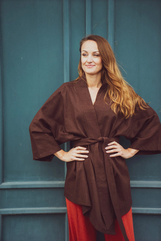 Nola linnen kimono-jack is een minimalistisch, loszittend kimono-stijl jack. Het jack wordt geleverd met een riem. Het linnen kimono-jack kan besteld worden in alle tinten van de Jade linnen jurk.