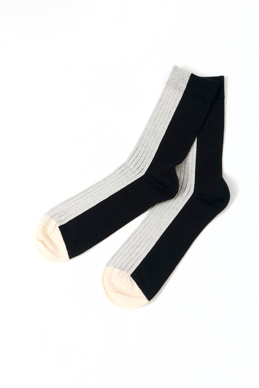 Tweekleurige katoenen geribde sokken tot halverwege de kuit. De stof voelt licht aan op de huid en beweegt gemakkelijk. Een betrouwbaar kledingstuk dat perfect past in de dagelijkse routine.
