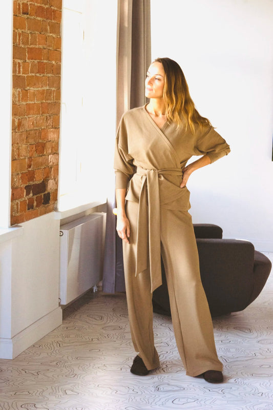 De Mena loungewear set is gemaakt van een prachtig vallende, uitzonderlijk comfortabele stof en bestaat uit een elegante wikkel-top gecombineerd met zachte rechte broekspijpen. De kenmerkende Mena loungewear stof is opmerkelijk zacht om aan te raken met een subtiele textuur, waardoor het een van de meest spannende en hoogwaardige materialen is die we tot nu toe in onze collecties hebben gebruikt.