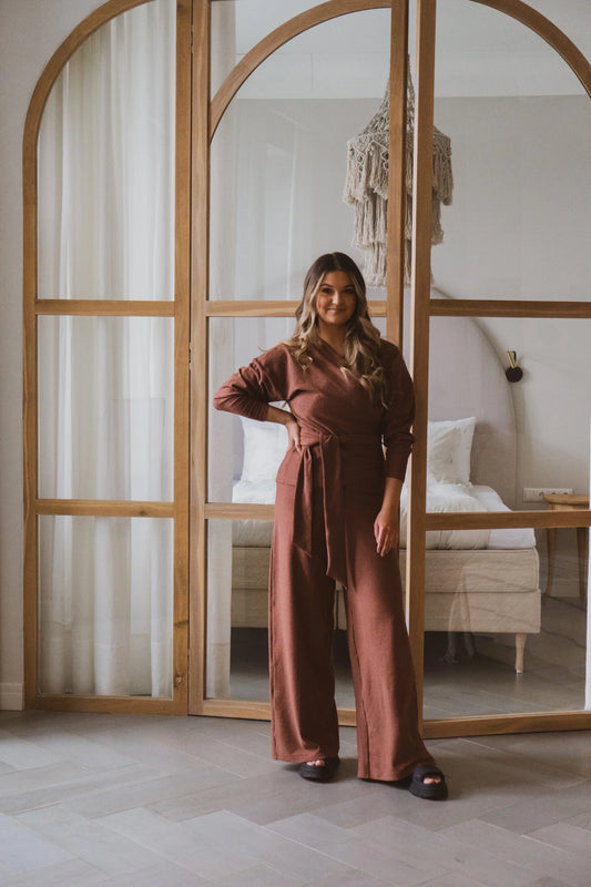 The Mena loungewear set combines a beautifully draping wrap-top with soft, straight-cut pants in a luxuriously comfortable fabric. Crafted from 90% cotton and 10% elastane, this set features a subtly textured weave that's exceptionally soft and one of our finest materials to date. Perfect for relaxing at home, working, or unwinding during downtime. The model pictured is 174 cm tall, typically wears M/L, and is shown in size M. If you prefer a different inseam length, please specify your desired measurement in the order notes.