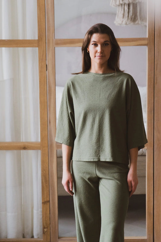 Omarm comfort met het Mena korte t-shirt, met een laid-back oversized silhouet en vloeiende driekwart mouwen. Gemaakt van eersteklas zachte stof met subtiele structuur, is het jouw go-to piece voor een relaxte, alledaagse stijl. Maak de Mena Loungewear-esthetiek compleet door het te combineren met de bijpassende Mena-broek.