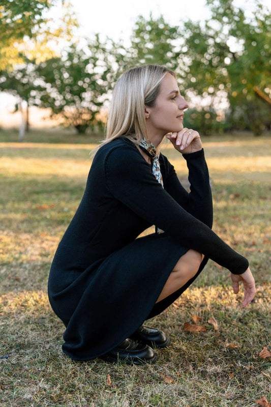 Tijdloze elegantie ontmoet duurzaam vakmanschap in onze Mini A-Line Dress. Dit stuk is gebreid van 100% verantwoorde merinowol en combineert zachtheid en ademend vermogen met een flatterend silhouet dat prachtig meebeweegt je. De ronde hals en lange mouwen zorgen voor een geraffineerd silhouet, terwijl de sierlijke A-lijn naadloos aansluit op de dag.