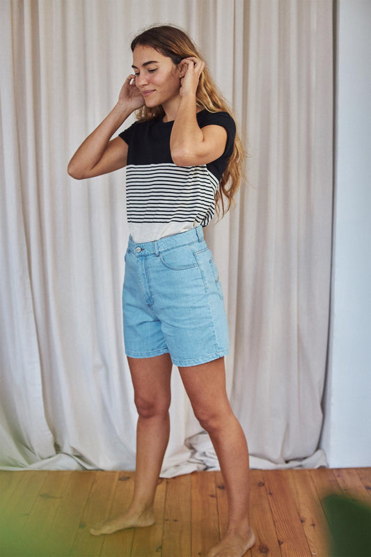 Gemaakt van zachte organisch slubstof met subtiele garengeverfde strepen, heeft de Molene een mouwloos ontwerp met omgeslagen manchetten, wat een tijdloze duurzame stijl belichaamt. Dit regelmatig passende kledingstuk toont ook ons subtiele geborduurde walvisembleem, dat de kwaliteit en ethos van TWOTHIRDS exemplificeert.
