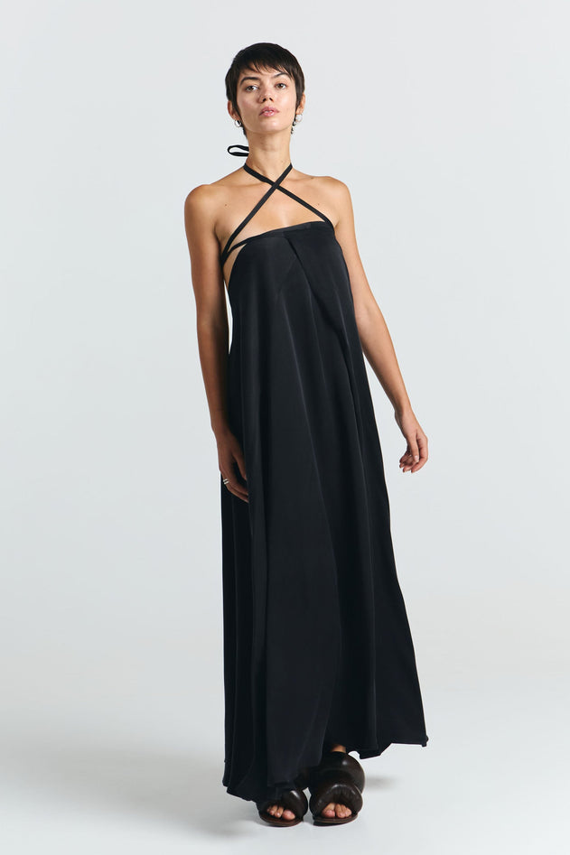 De luxueuze cupro stof heeft een verbluffend, lichtgewicht gevoel, en de jurk valt prachtig voor een moeiteloos chique uitstraling.