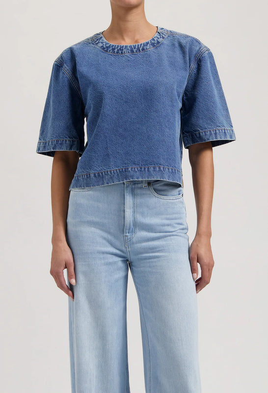 Het model Tess geeft een denimlook aan een klassieke topconstructie. Met split achter, oversized mouwen en een korte pasvorm, geeft deze stijlvolle denim top elke outfit iets nieuws.