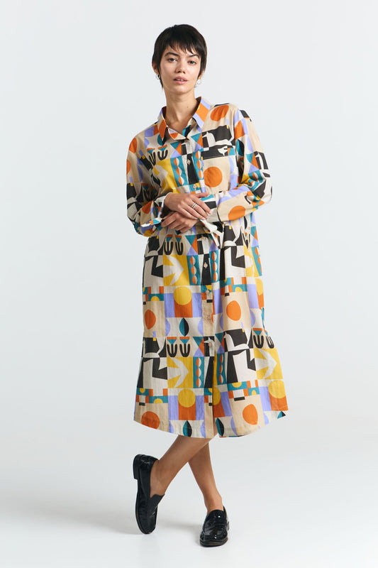 Nahuas is een casual overhemdjurk met lange mouwen, speelse lintmanchetten en een chique sluiting aan de voorkant met veganistische corozo-notenknopen. De levendige en kleurrijke Vibes-print maakt het onderscheidend ten opzichte van jouw gewone overhemdjurken.