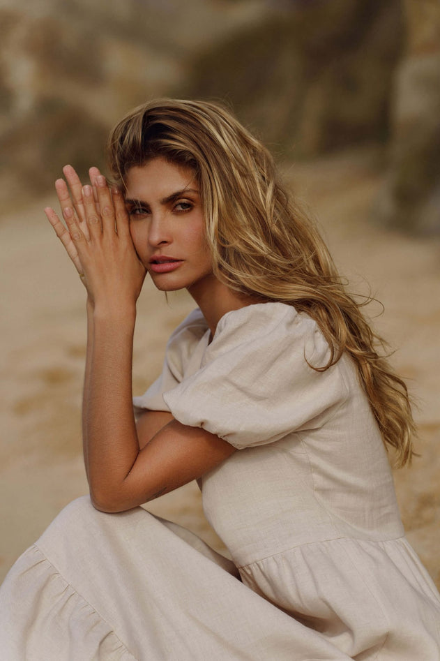 De Astrid-jurk is een losse maar flatterende zomerjurk met prachtige pofmouwen. Deze lange linnen maxi-jurk is een zorgeloze en vrouwelijke keuze voor warme dagen. Gemaakt van 100% linnen, de prachtig vallende gelaagde jurk is een zomerbasis die gemakkelijk te stylen is naar jouw persoonlijke smaak.