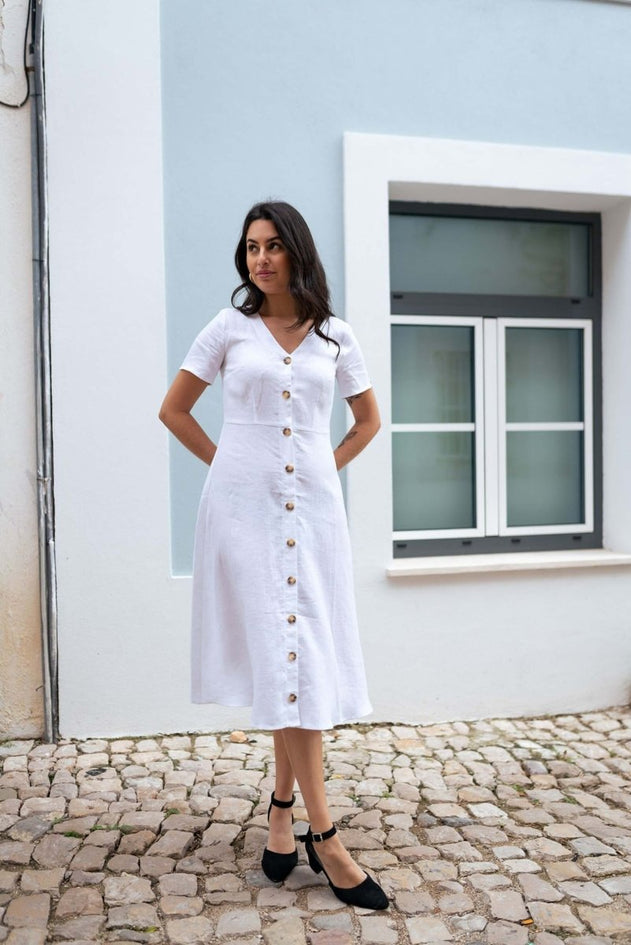 Gemaakt van hoogwaardig linnen, heeft de Penelope-jurk een ontspannen, midi-lengte snit, waardoor het een perfecte keuze is voor elke gelegenheid. De prachtig passende jurk loopt iets uit naar de zoom, wat zorgt voor een elegante en luchtige uitstraling.