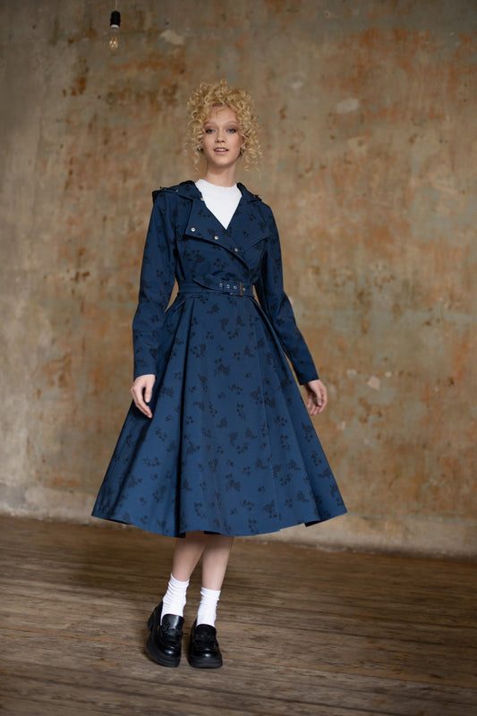 Wikkel jezelf in deze prachtige double-breasted jas, gemaakt van diep, donkerblauw stof versierd met een zwarte bloemenprint die doet denken aan de middernachtelijke hemel. De zwarte satijnen voering voegt een vleugje klassieke schoonheid toe, waardoor je stijlvol en gezellig blijft. Deze jas combineert perfect romantiek en elegantie, waardoor het een must-have is voor elke vrouw die wil opvallen in elk weer.