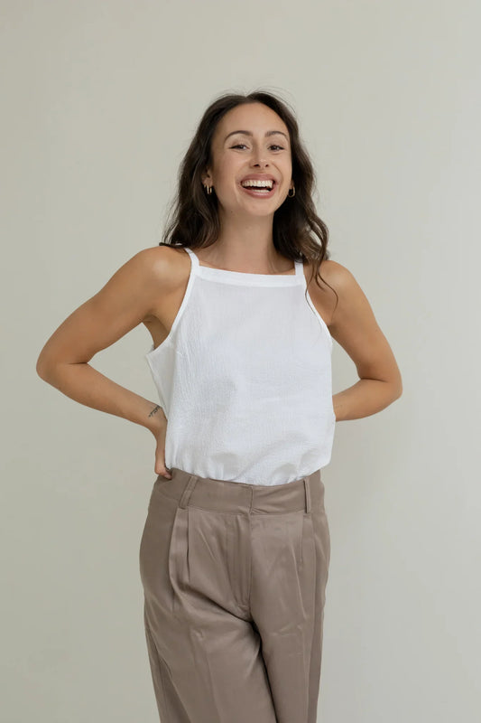 Deze lichtgewicht top gemaakt van organisch katoen is zeer licht en comfortabel op de huid. De top is gemaakt van seersucker en heeft een lichte textuur. Het geeft je een lichte, zomerse uitstraling en is een absolute must-have voor elke garderobe. Met deze mouwloze witte katoenen top, je hebben het perfecte stuk voor jouw capsule garderobe.