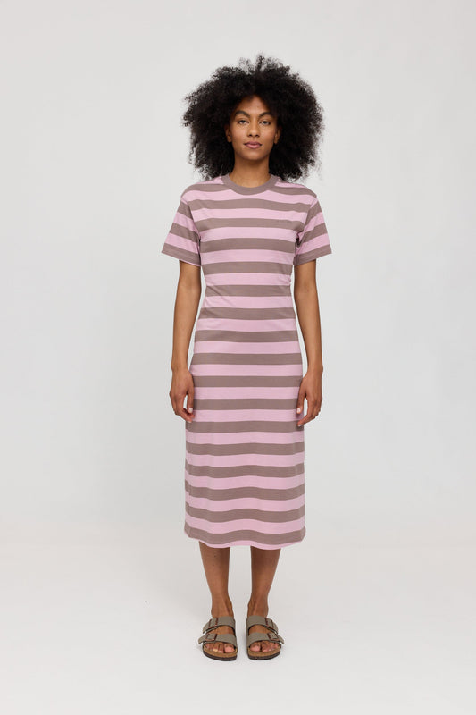 De Midi Block Stripes Jurk van Mazine heeft een modern, eenvoudig ontwerp. Gemaakt van 100% GOTS-gecertificeerd organisch katoen, het is comfortabel en perfect voor dagelijks gebruik. De zware single jersey zorgt voor een geweldige pasvorm en vormbehoud. Met zijn normale pasvorm, ronde halslijn en gestreepte print, voegt deze jurk een dynamisch tintje toe, afgewerkt met een subtiele logoprint aan de zoom.