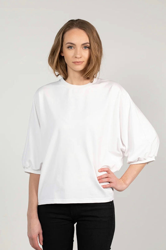 Nola's Yoko T-shirt is a minimalist cut t-shirt with wide sleeves that reach the elbow. The sleeves have ribbing at the openings, which creates a slight puff-sleeve effect.