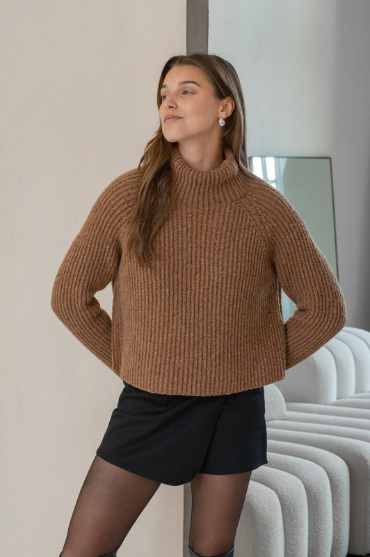 De STORY OF MINE Coltrui in de kleur bruin is ontworpen met een mix van gerecyclede materialen, waaronder 60% gerecyclede wol. Hierdoor bevat het materiaal verschillende kleurpigmenten en is de trui extreem zacht, wat uitzonderlijke warmte biedt.