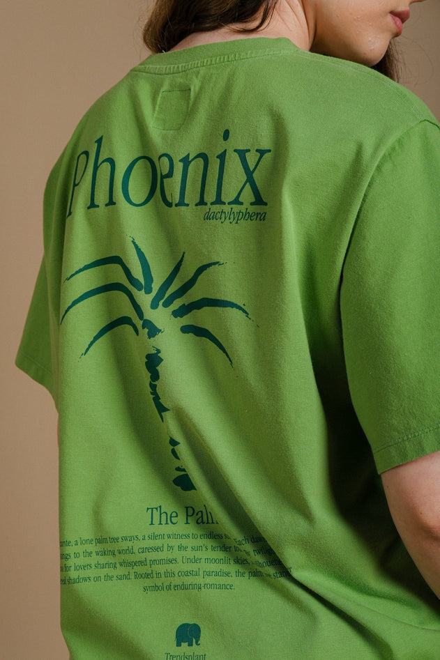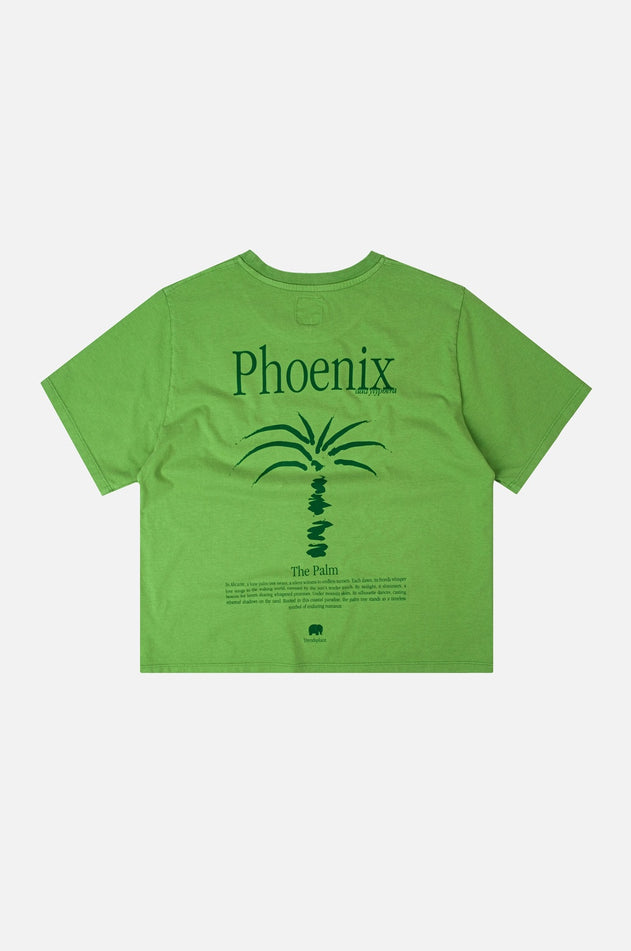 Dit Dames's Pigment T-Shirt in Phoenix Raquis Green heeft een kort ontwerp, wat een stijlvolle en moderne uitstraling biedt voor elke outfit. Geïnspireerd door de Phoenix-palm, toont de achterkant een palmboomafbeelding naast het woord "Phoenix."