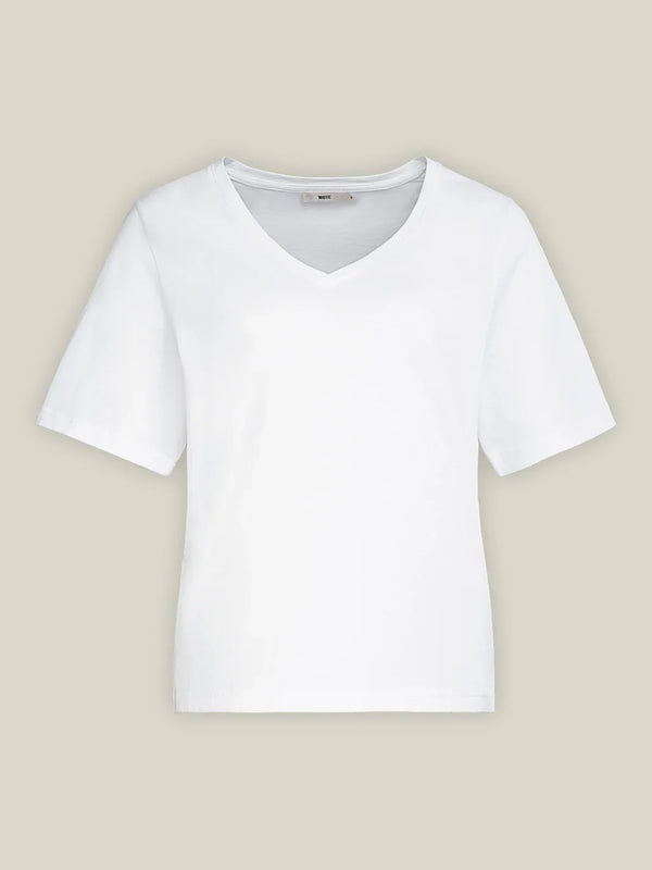 Dit minimalistische V-hals T-shirt, gemaakt van organisch katoen, is een tijdloze basic en een essentieel stuk voor elke capsule garderobe. De diepere halslijn benadrukt een slanke silhouet en voegt een vleugje vrouwelijkheid toe aan de look.