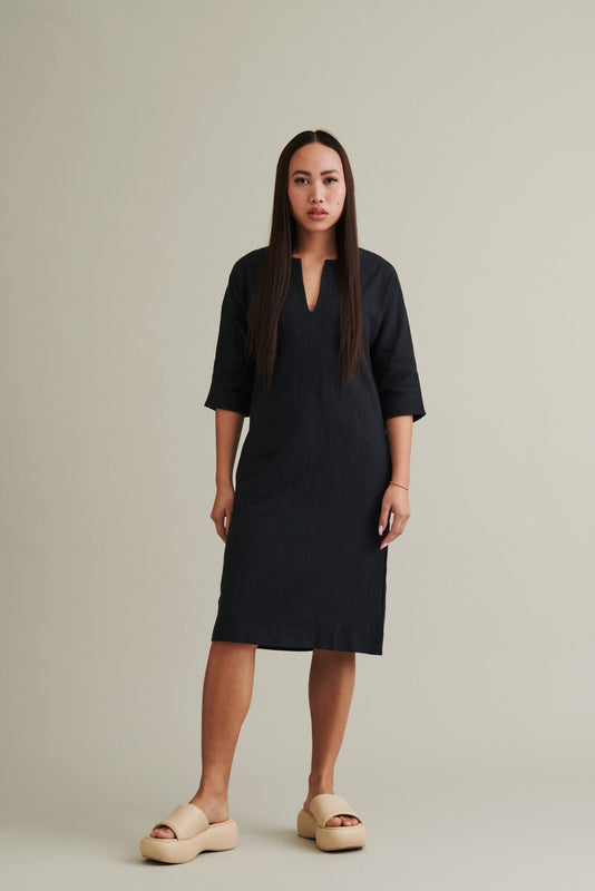 Een simpelweg prachtige en klassieke linnen jurk. Het heeft kimono-mouwen en een vrij diepe split bij de halslijn. De jurk heeft een rechte silhouet. Gemaakt van iets dikker 100% steen gewassen linnen, dat prachtig valt en behandeld is om zacht te zijn. Er zijn zakken in de zijnaad.